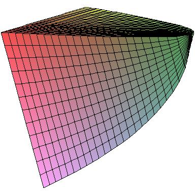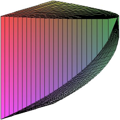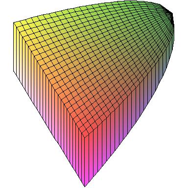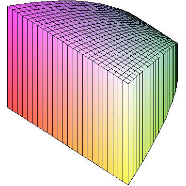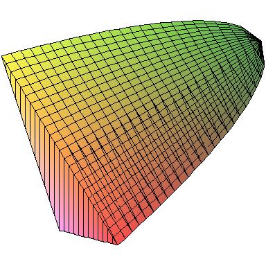 First, here's the solid described in problem 35 from section 6.2. The base is the parabolic region B = {(x,y): x2 ≤ y ≤ 1} and the cross-sections perpendicular to the y-axis are squares. All these figures represent the same solid, just viewed from different angles. In the left-hand figure, you can see the square cross-section. In the middle, the face pointing up is the region B.